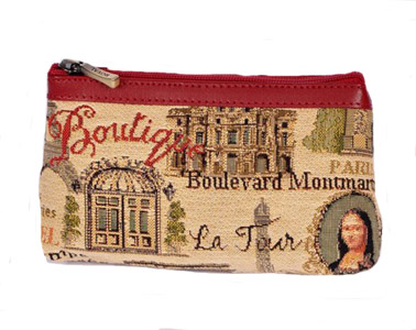 Tapestry and leather case.
